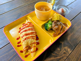オムライスの具とハンバーグには大豆ミートを使用し、デミグラスソースは当店の手作り!